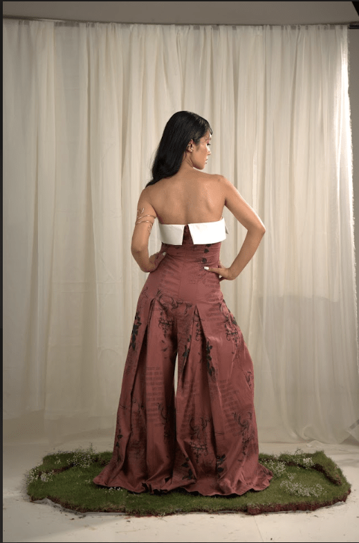 A jumpsuit that commands attention with subtle boldness A strapless silhouette adorned with a keyhole neckline and custom print, it flows into wide pleated legs, striking the perfect balance between art and allure.